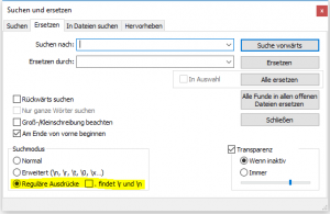 1. Man öffnet das Suchen und Ersetzen Dialog und achtet, dass der Suchmodus Reguläre Ausdrücke ausgewählt ist.